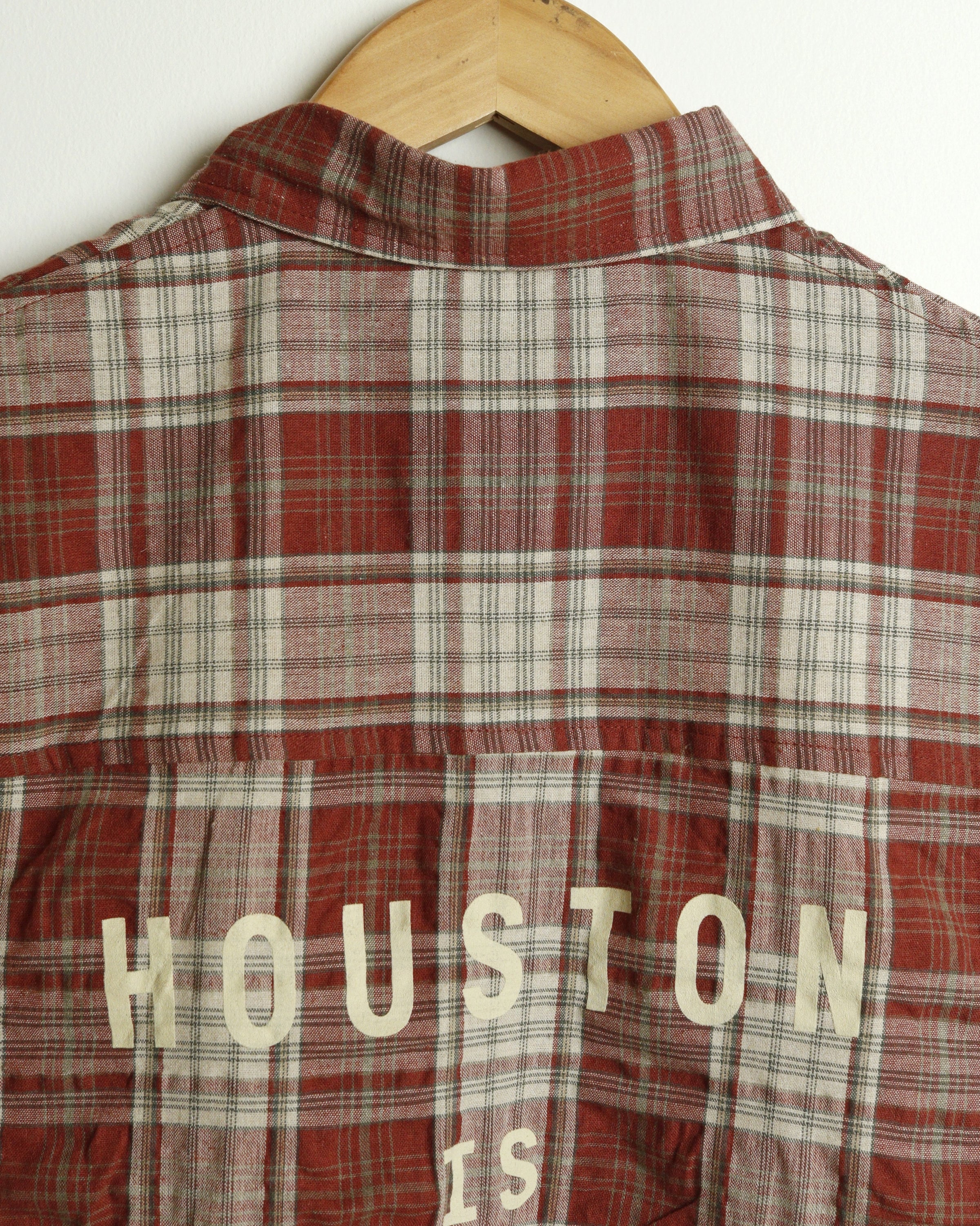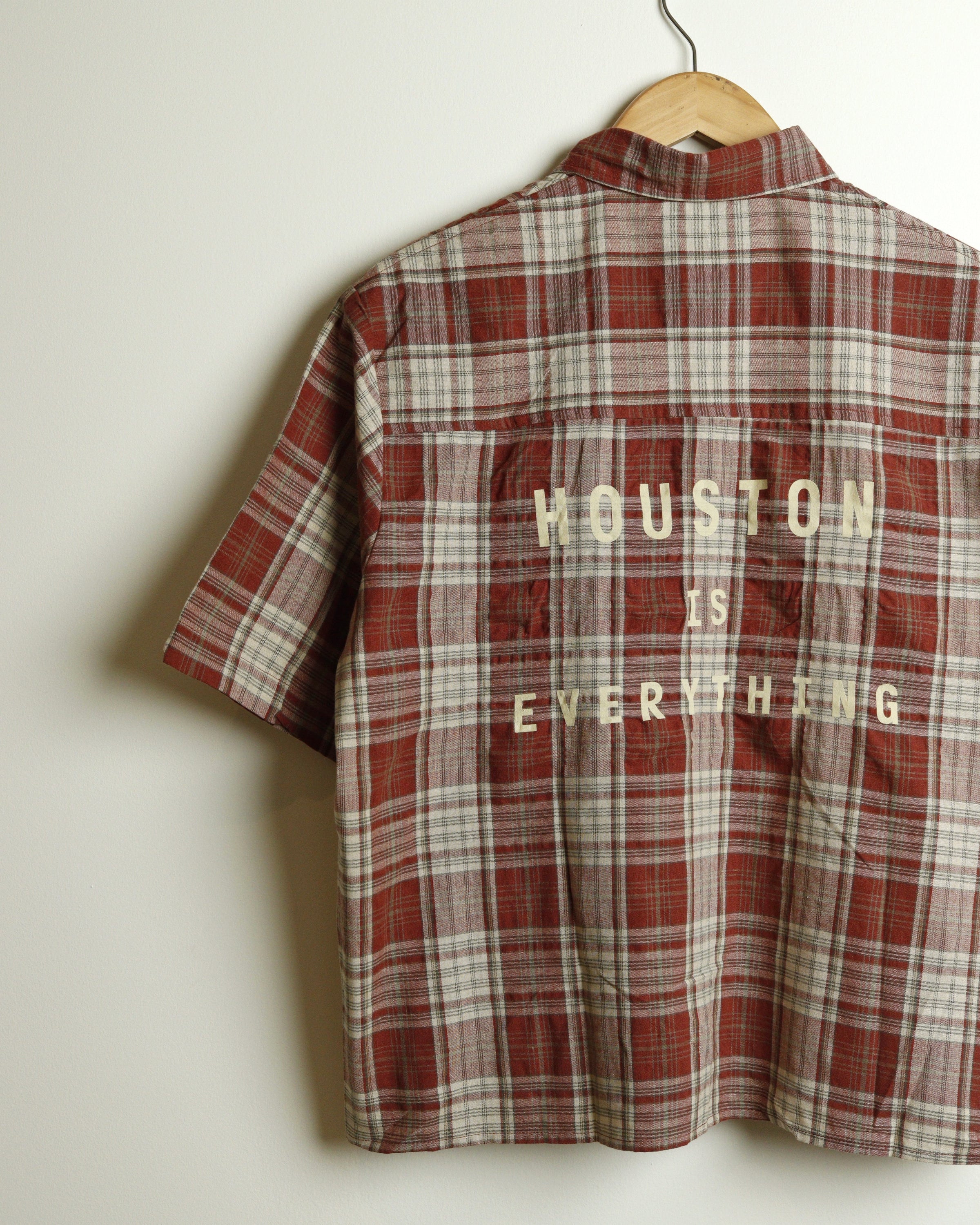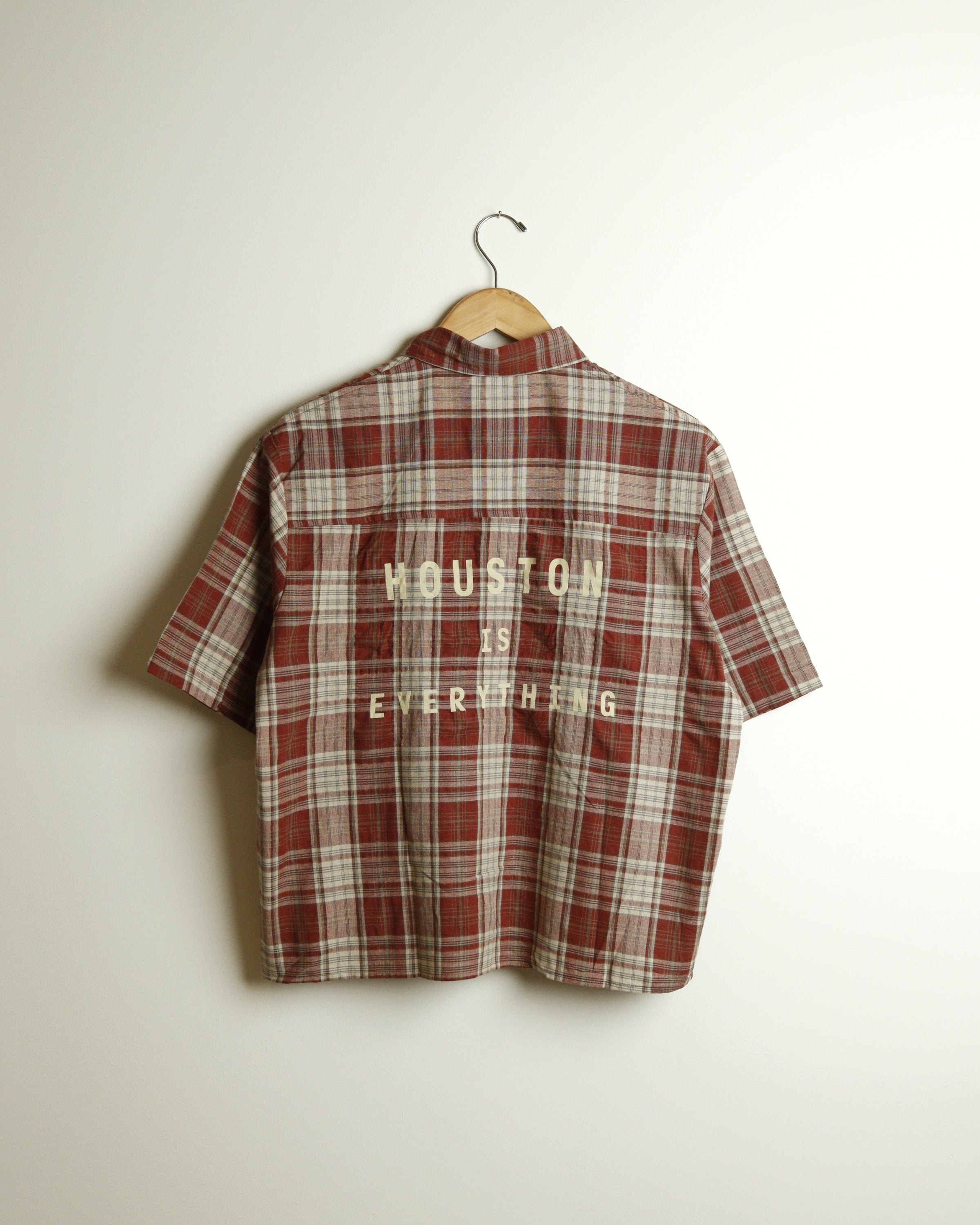 Our classic Houston is Everything design on a unisex crimson red plaid cropped shirt.