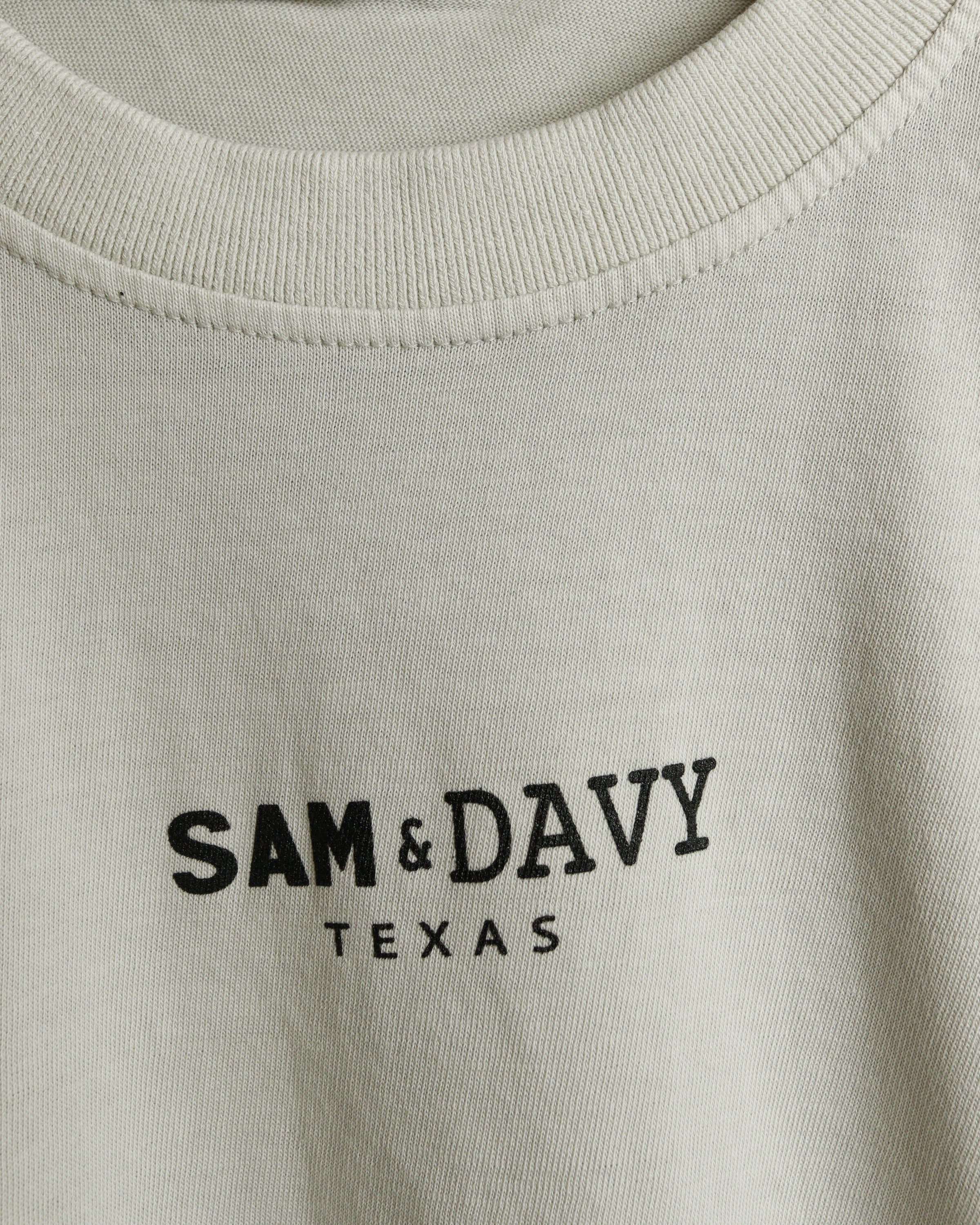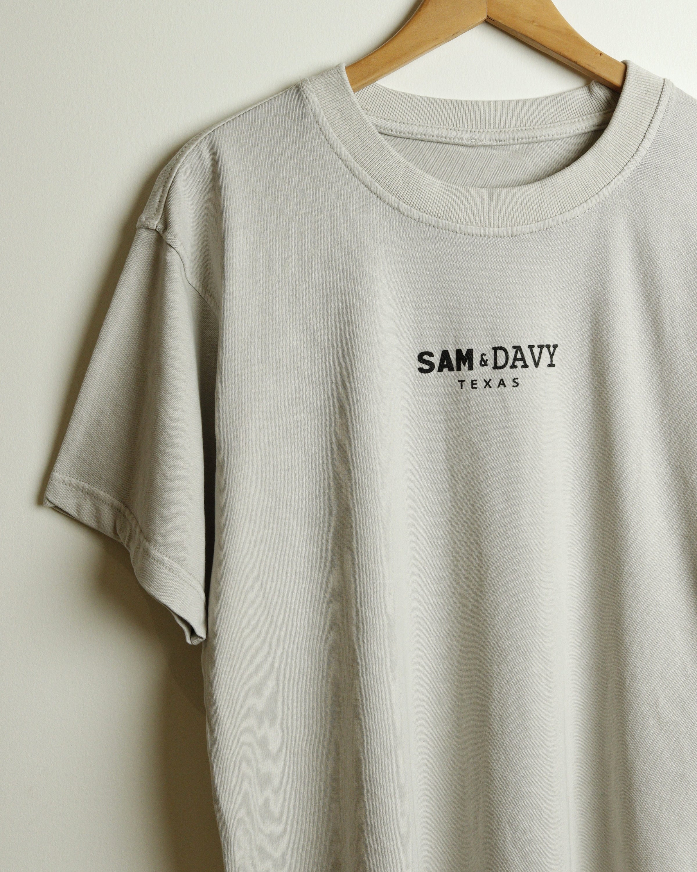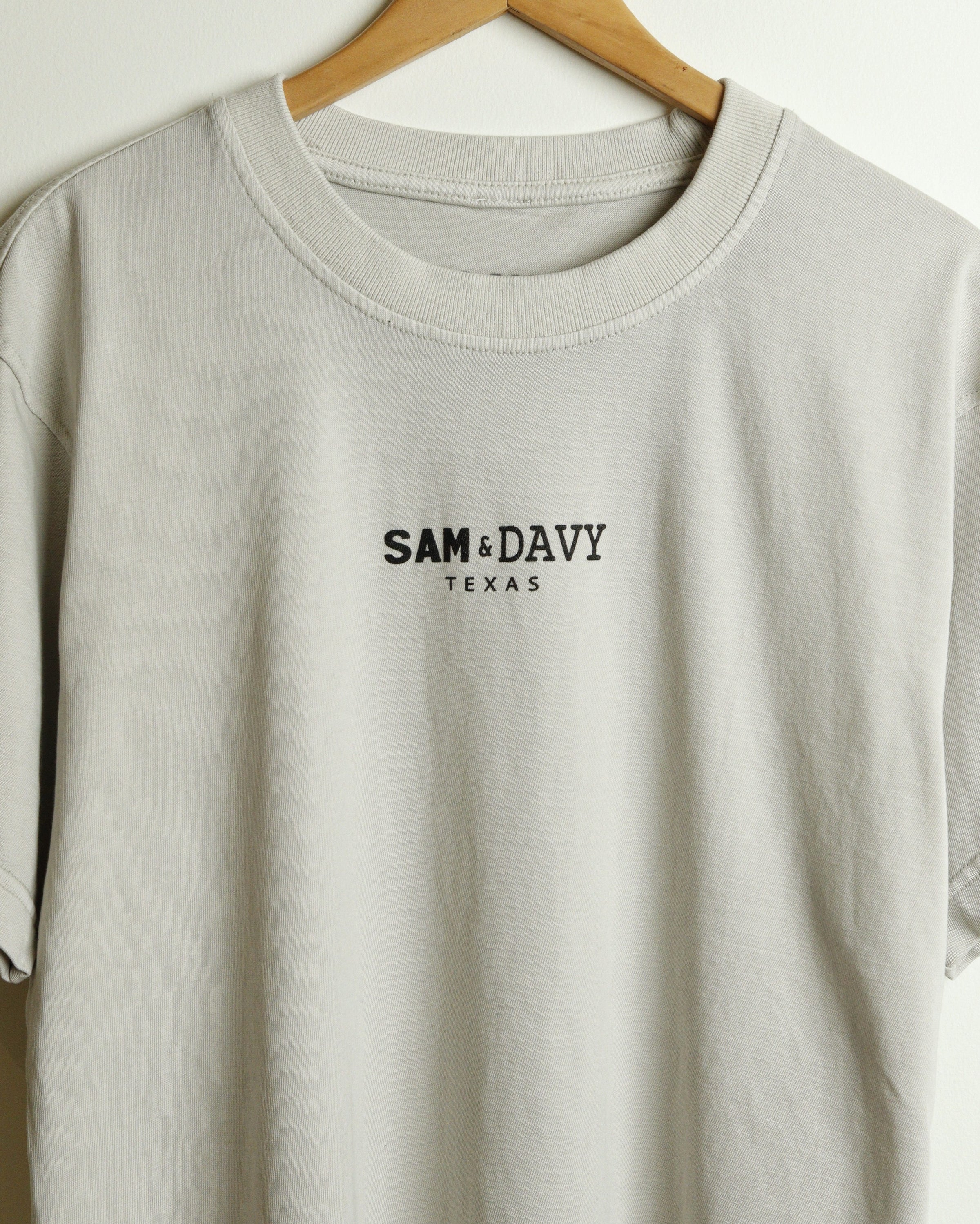 The SAM & DAVY primary logo on our best-selling open weave tee in silver.