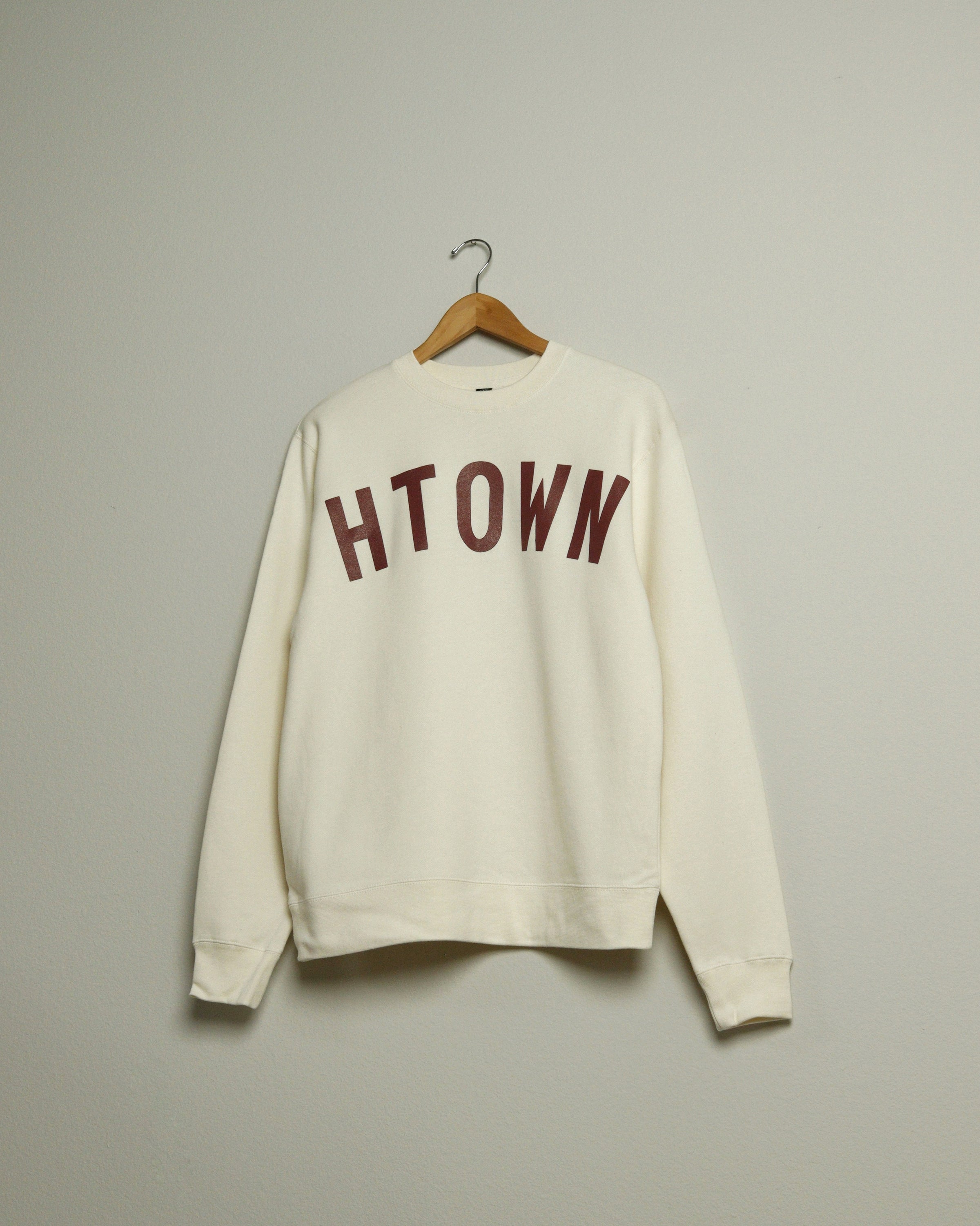 A bold jumbo version of our classic HTOWN printed in an elegant oxblood red on a eggshell white crewneck sweatshirt. The perfect sweatshirt for a chilly day or a trip to the stadium. Unisex style follows men's sizing.