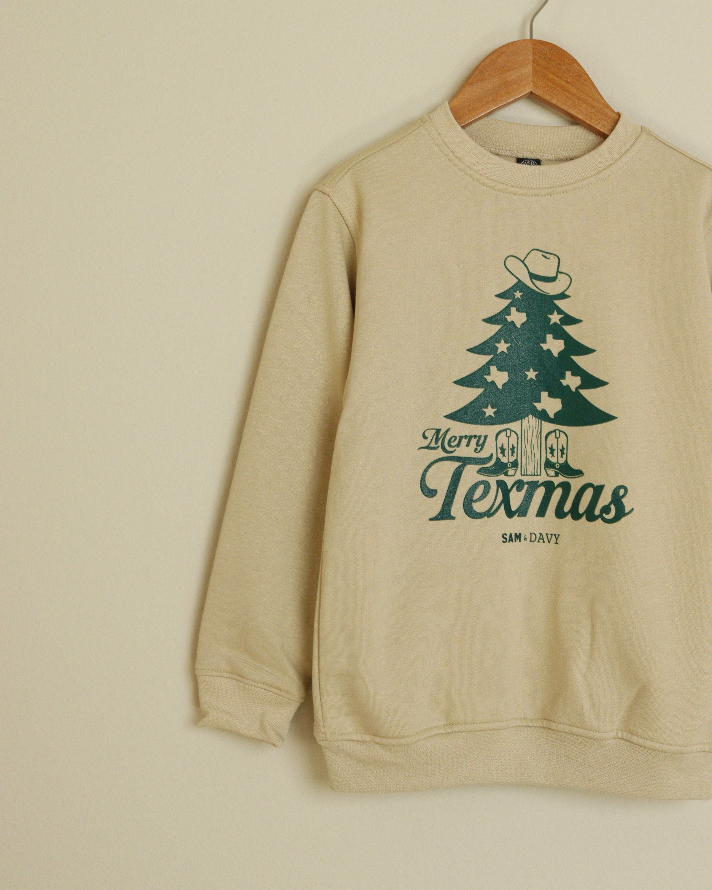 The Merry Texmas Toddler Crewneck Sweatshirt in cream and pine green.