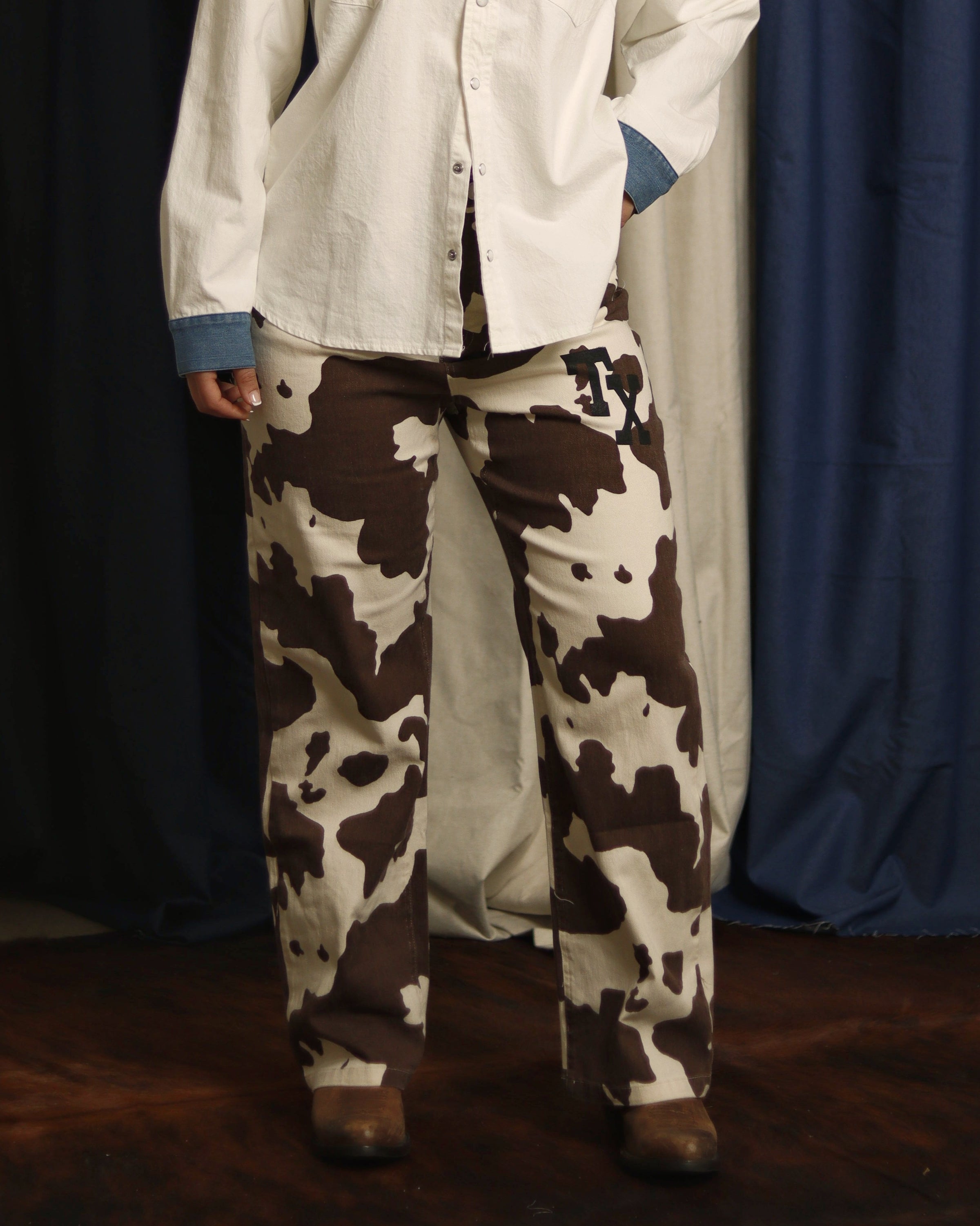 The Texas Cow Print Denim Jeans feature a classic cow print design with TX logo for a little extra Texan flare.