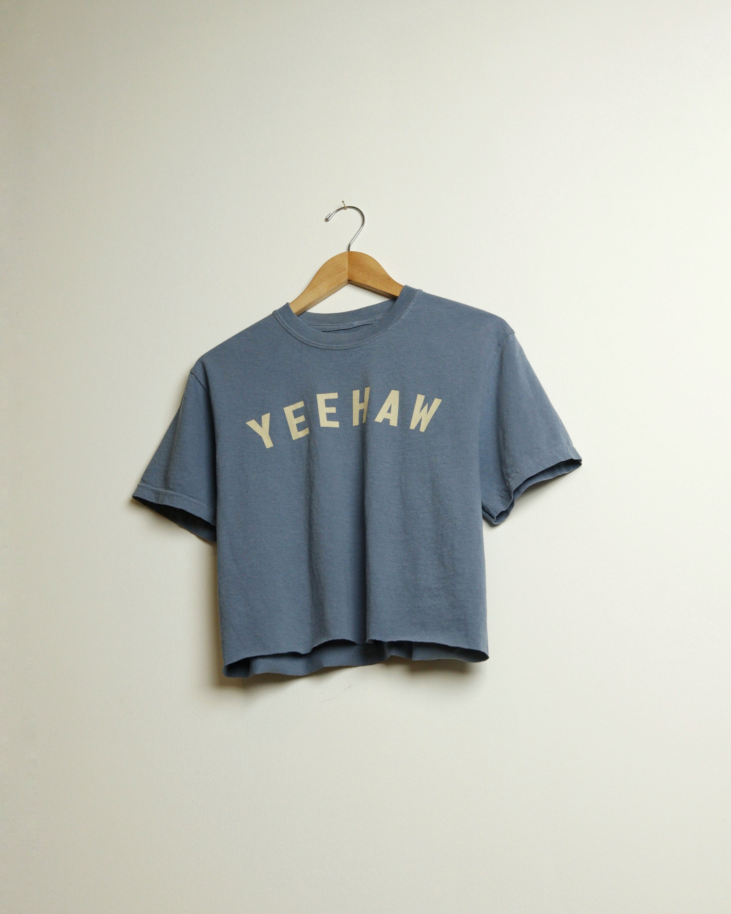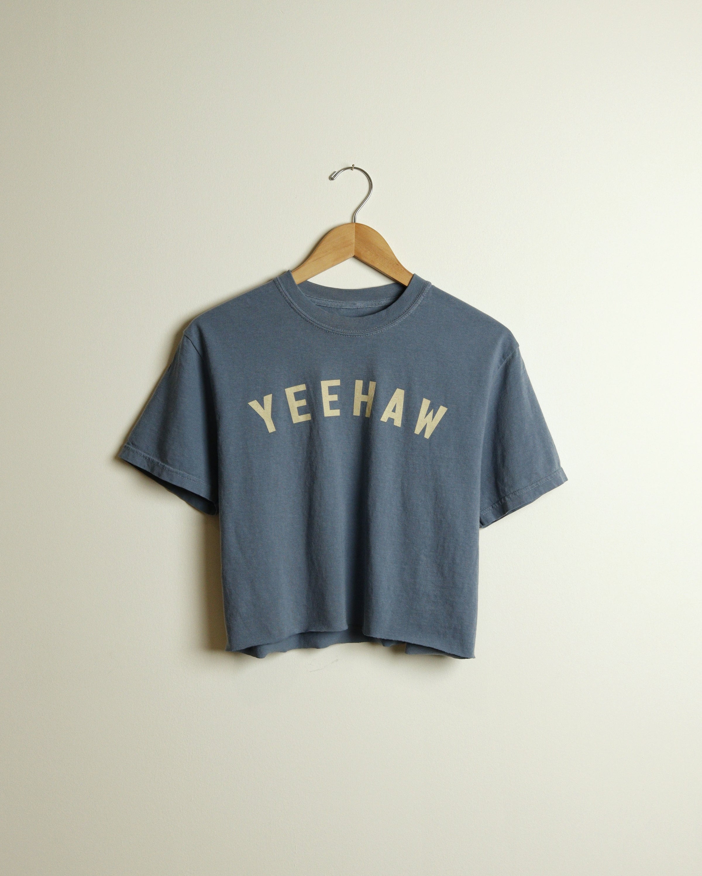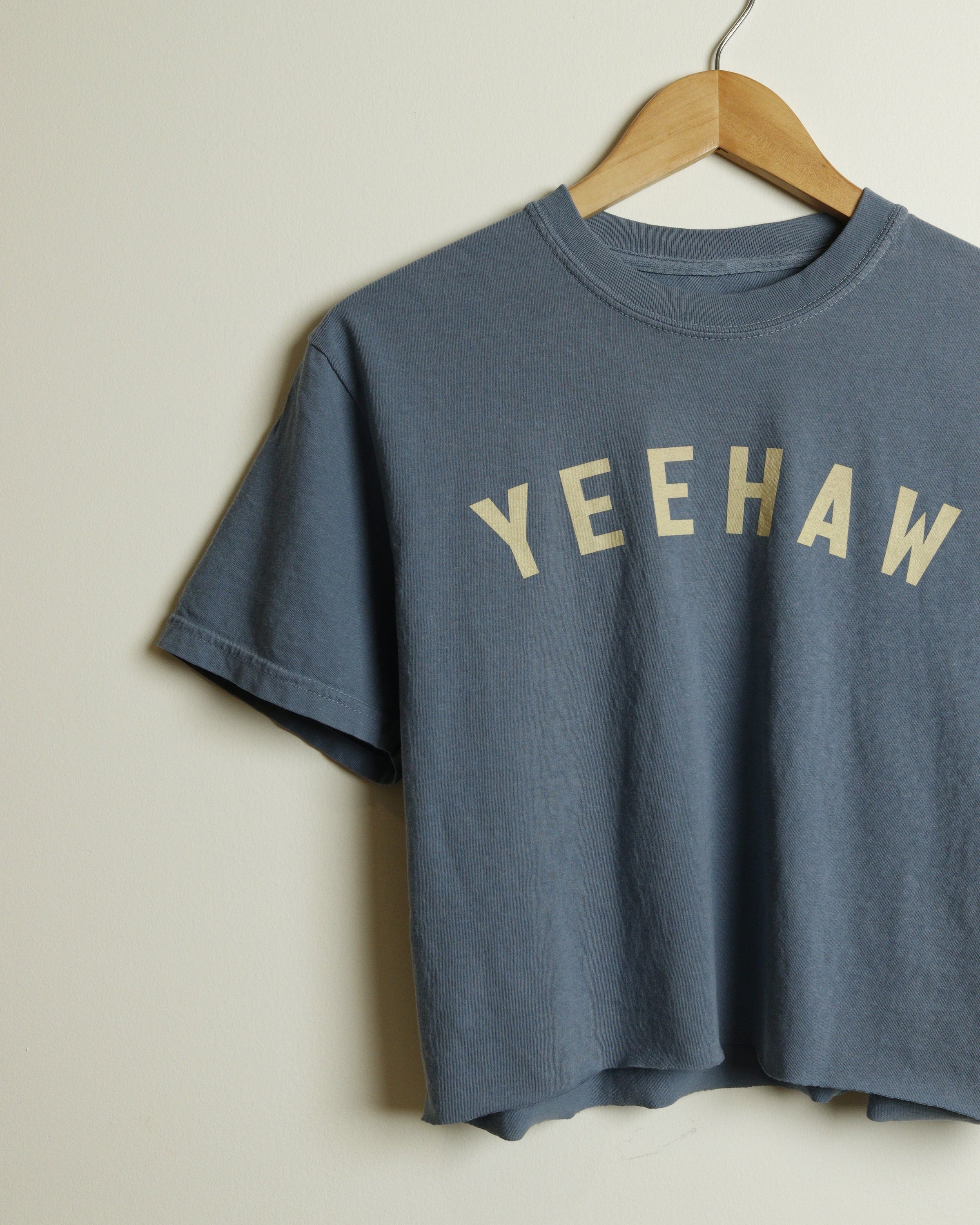 Our classic Yeehaw printed on a women's vintage-wash cropped t-shirt in denim blue